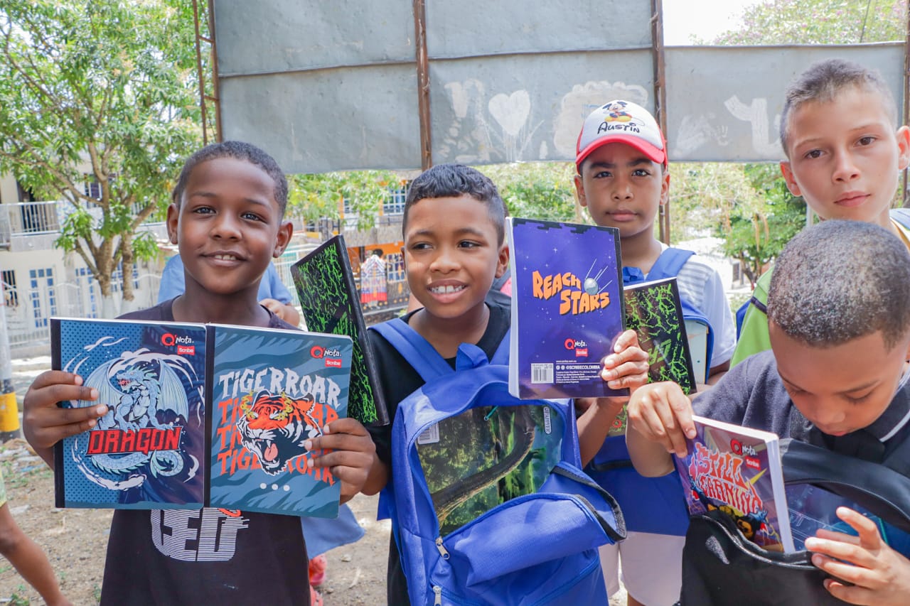 Aguas de Cartagena hizo entrega de 300 kits escolares a estudiantes, entre 8 y 11 años de edad, residentes en zonas vulnerables de la ciudad y sus corregimientos.