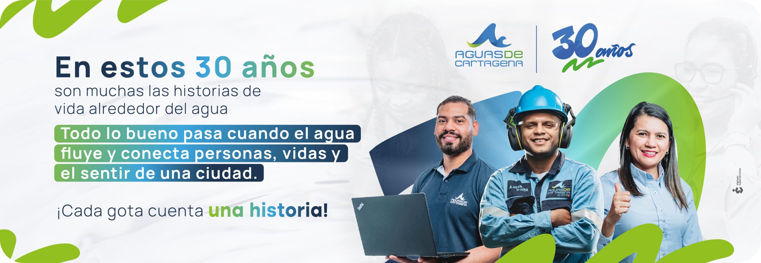 Aguas  de Cartagena, 30 años, impulsando el bienestar de los cartageneros, a través de un servicio eficiente, confiable y comprometido con la renovación del recurso hídrico y la transformación ecológica de la ciudad.