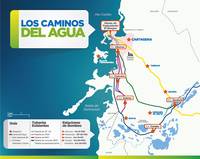 El agua que consume Cartagena proviene del Canal del Dique, brazo del río Magdalena, a través de dos estaciones de bombeo con sistemas de tuberías de conducción independientes: Dolores y Gambote. Desde las estaciones, el agua cruda recorre unos 45 kilómetros hasta la Planta de Tratamiento “El Bosque” ubicada en el barrio Paraguay de Cartagena. Una vez el agua es captada en la estación Dolores o de Gambote, es conducida entre las estaciones de bombeo por las siguientes aducciones: Dolores – Piedrecitas, Piedrecitas – Albornoz y Albornoz-Planta de Tratamiento El Bosque.