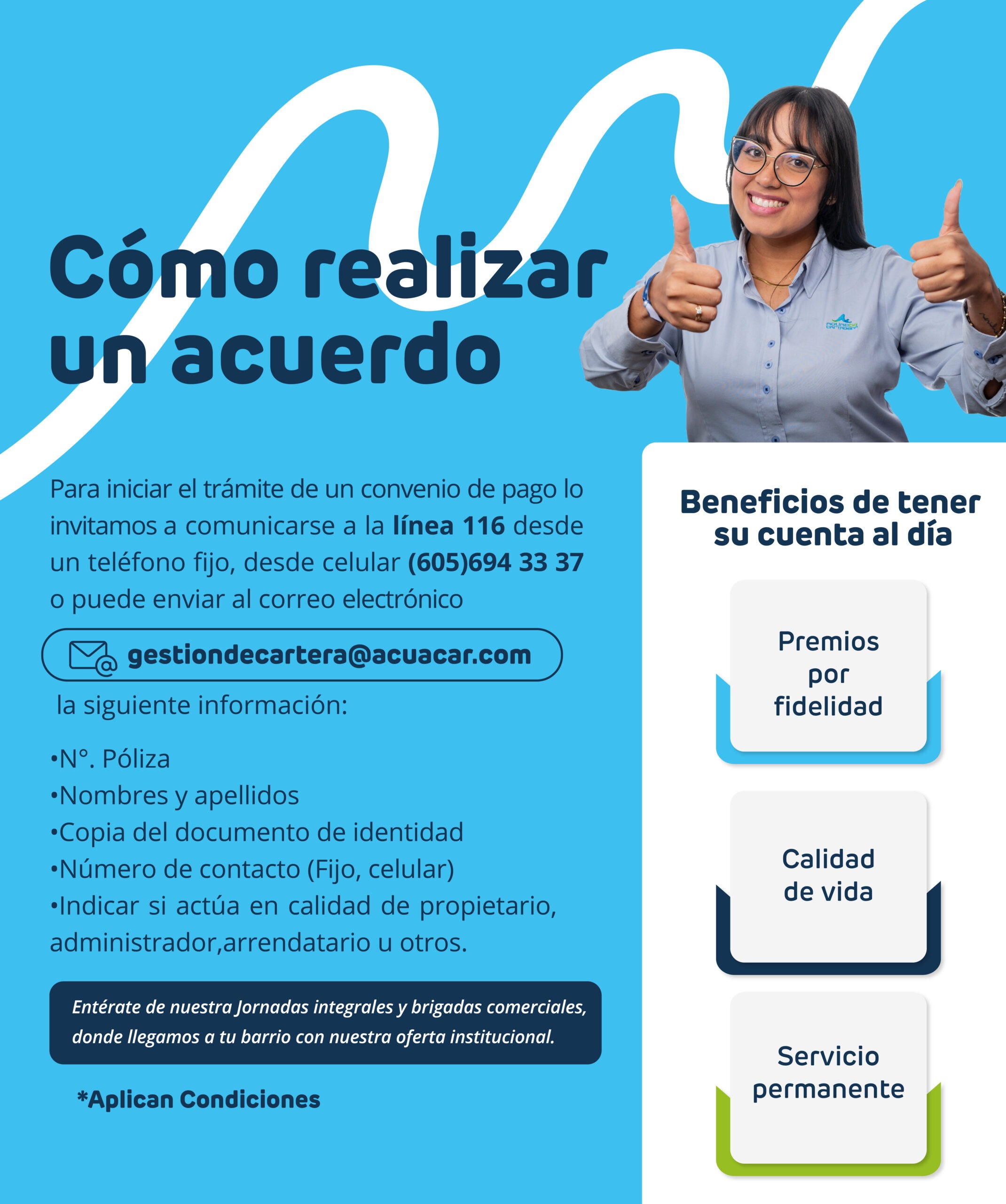 Aguas de Cartagena S.A. E.S.P. buscando siempre mejorar la calidad de vida de la comunidad cartagenera, ha desarrollado un programa que le permitirá cancelar su factura y acceder a facilidades de pago, para lo cual cuenta con diferentes canales de servicio: